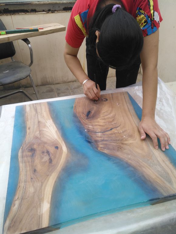 做為最流行的河流樹脂桌面,一般都是使用耐黃變的樹脂,戶外有效耐黃5-7年,室內(nèi)基本就是永久性的。下面這個(gè)是用色精添加的桌子,也可以根據(jù)自己的愛好選擇添加。